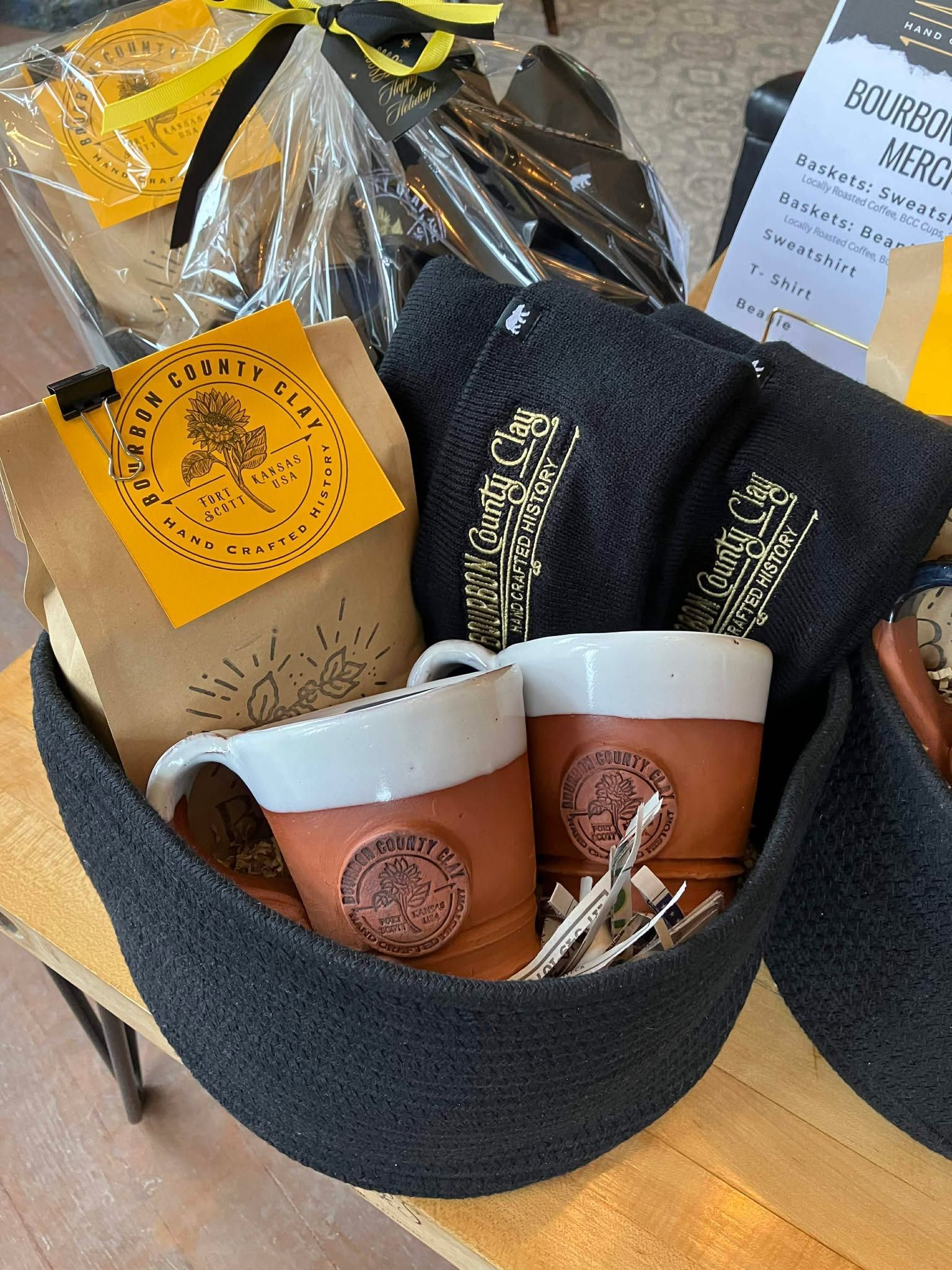 In this gift basket you will receive a Black Roped Basket with two Coffee Mugs made from Bourbon County Clay, Two one-size Beanies from Key with Bourbon County Clay Logo, & 1lb of Privately Roasted of Bourbon County Clay made from locally sourced, Branch Coffee Roasting!